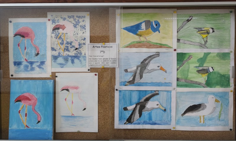 A exposição “Aves de Portugal”, está a decorrer no corredor da Biblioteca da Escola Básica José Carlos da Maia, com os trabalhos realizados pela turma do 7º D (JCM), na disciplina de Artes Plásticas, explorando a temática das aves portuguesas, enquanto elementos do Património Natural de Portugal. Para esta atividade os alunos utilizaram as técnicas de pintura a lápis de cor, pastel de óleo, pastel seco, aguarela, colagens e tinta acrílica.
